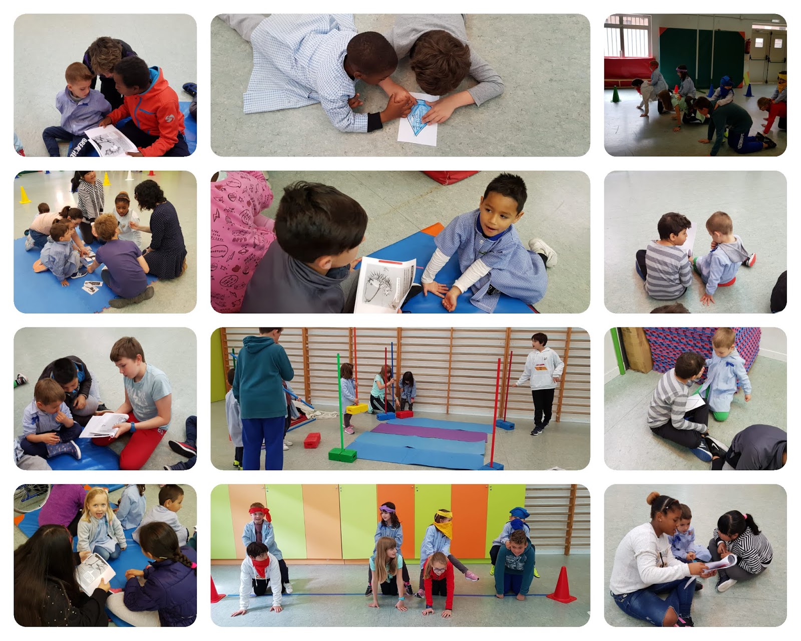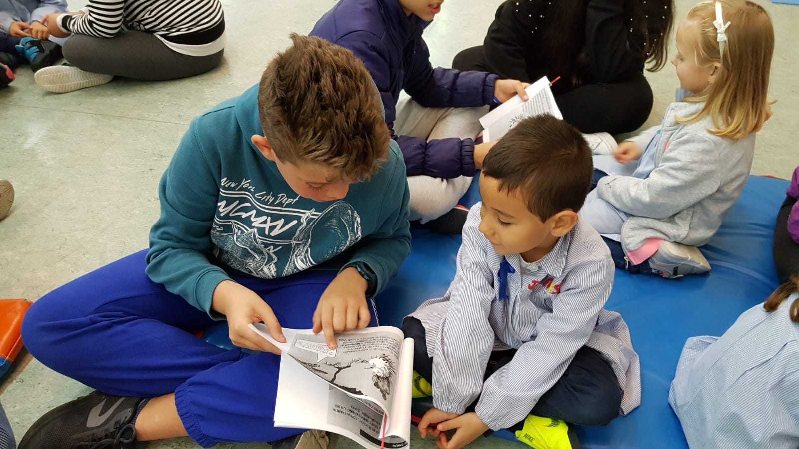 Cada pequeño elige a un mayor y con él realiza la lectura compartida y las preguntas durante media hora; la hora restante de la actividad se agrupan cinco parejas que pasan por las 5 estaciones.En cada una desarrollan, de forma cooperativa, la propuesta que previamente se les ha explicado.